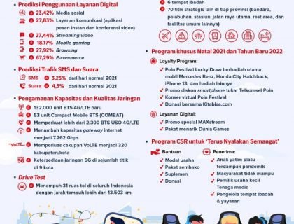 Jakarta – Menyambut momen Hari Raya Natal 2021 dan Tahun Baru 2022 (NARU), Telkomsel konsisten memperkuat perannya sebagai perusahaan telekomunikasi digital terdepan di Indonesia dengan mengajak seluruh masyarakat untuk ‘Terus Nyalakan Semangat’ dalam membangkitkan optimisme bangsa di tengah pandemi COVID-19 yang masih berlangsung. Penguatan peran tersebut dilakukan melalui sejumlah aktivitas dan program perusahaan yang fokus kepada upaya pengamanan kapasitas dan kualitas jaringan broadband, jaminan ketersediaan produk dan layanan unggulan, program loyalitas pelanggan, ragam pilihan platform dan layanan digital terdepan, serta berbagi untuk sesama melalui program corporate social responsibility (CSR) perusahaan.